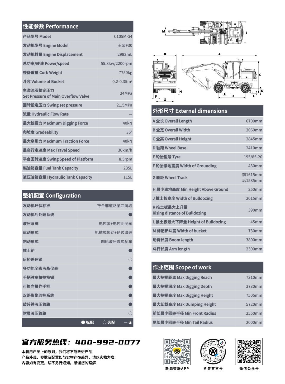 顺应轮挖升级潮流,,,,,,U乐国际C105MG4,,,,,,应运而生,,,,,,手动挡,,,,,,轮边桥,,,,,,双油缸,,,,,,巨细臂总长6.2米,,,,,,55.8千瓦玉柴国四发念头,,,,,,兼顾动力与油耗,,,,,,山区轮挖作业的一个理想选择。。。。